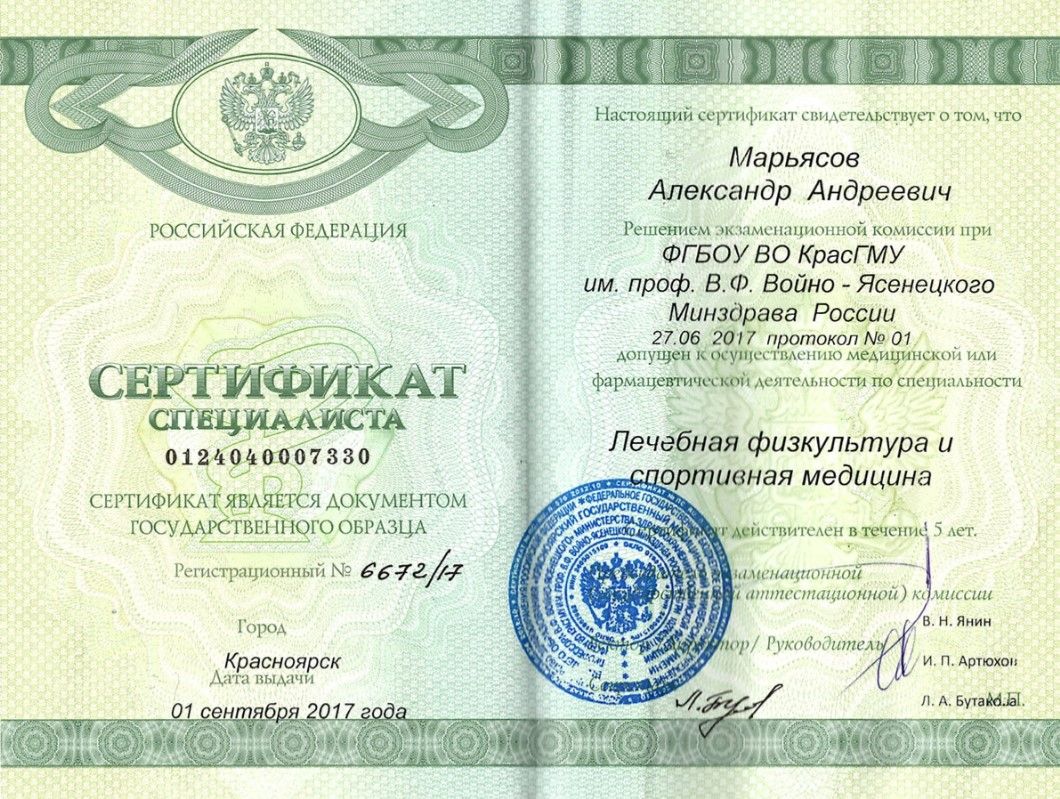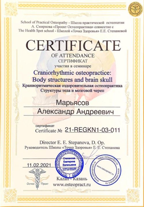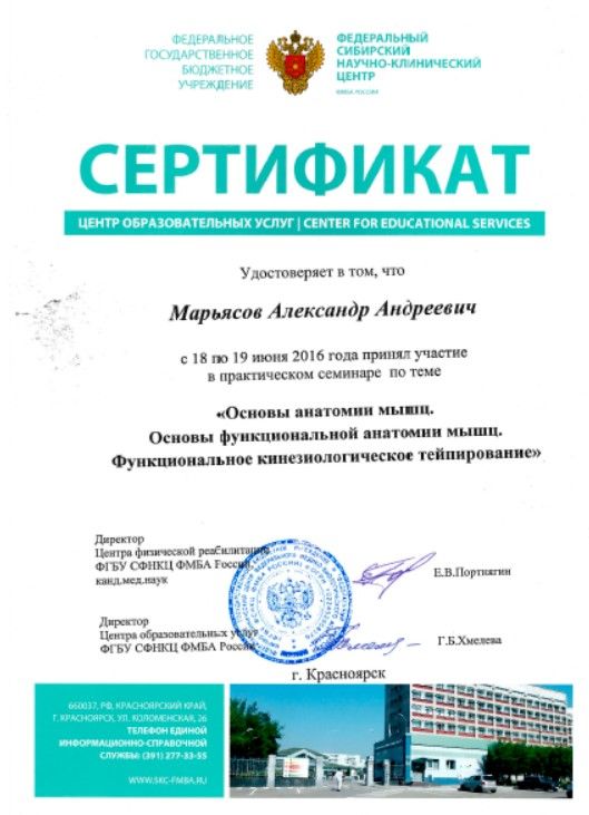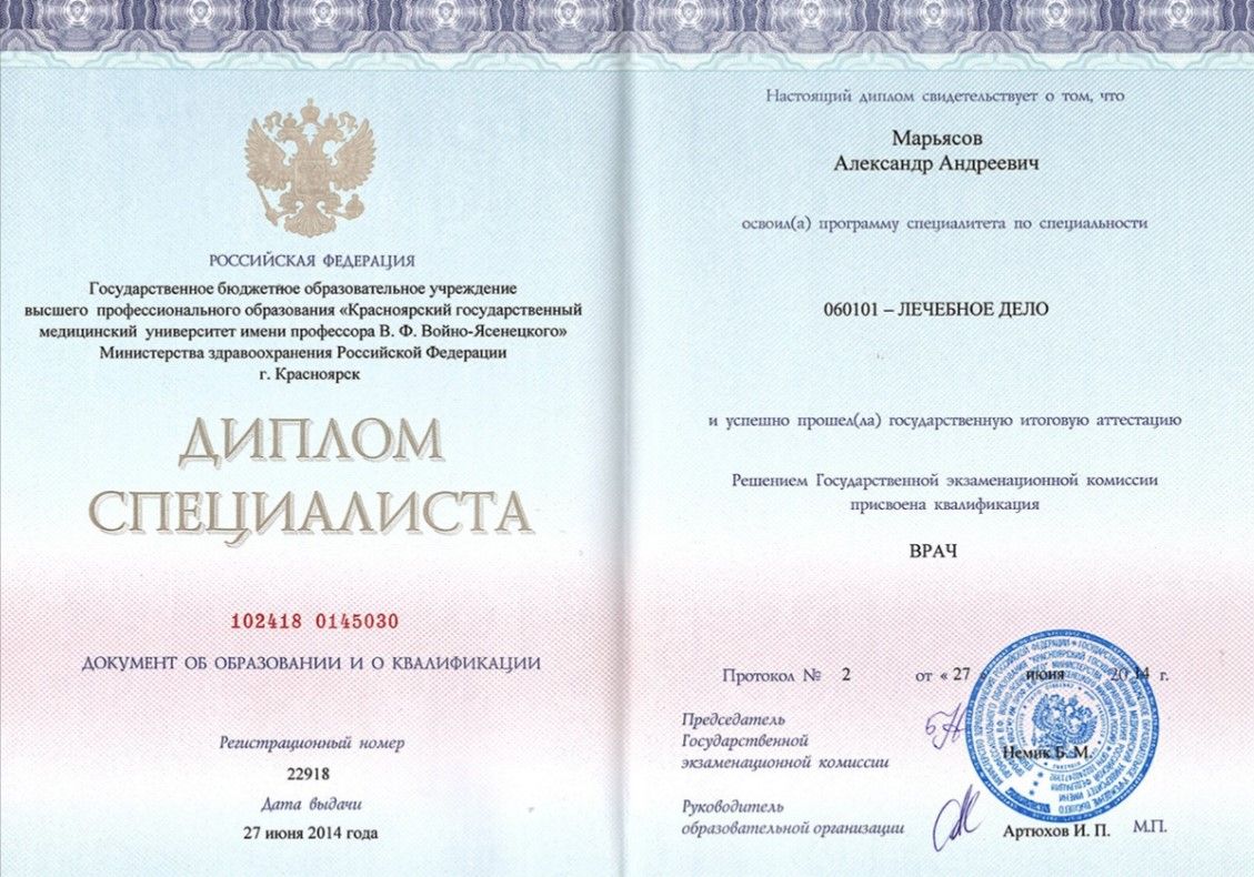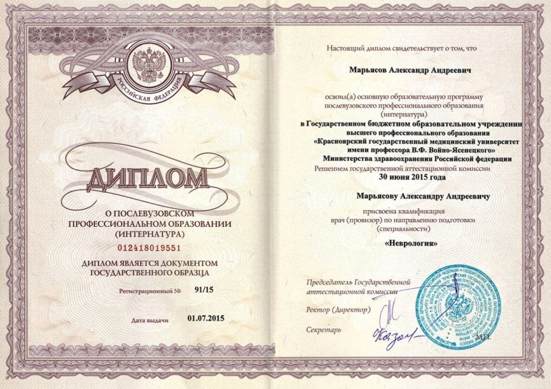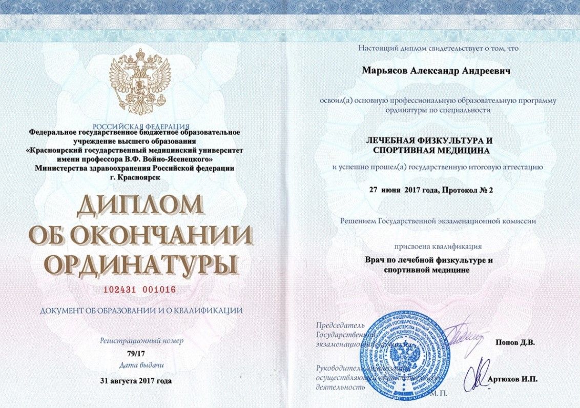 Красноярский государственный медицинский университет (2014)2015 г. - интернатура по специальности «Неврология», Красноярский государственный медицинский университет2017 г. - ординатура по специальности «Лечебная физкультура и спортивная медицина», Красноярский государственный медицинский университет;ординатура "Организация здравоохранения и общественное здоровье"Дополнительное образование:"Системная оздоровительная остеопрактика. Первичная дисфункция тела", Школа практической остеопатии;"Специалист остеопрактики", Проект Остеопрактика;"Специалист миорефиксии", Академия оздоровительных методик